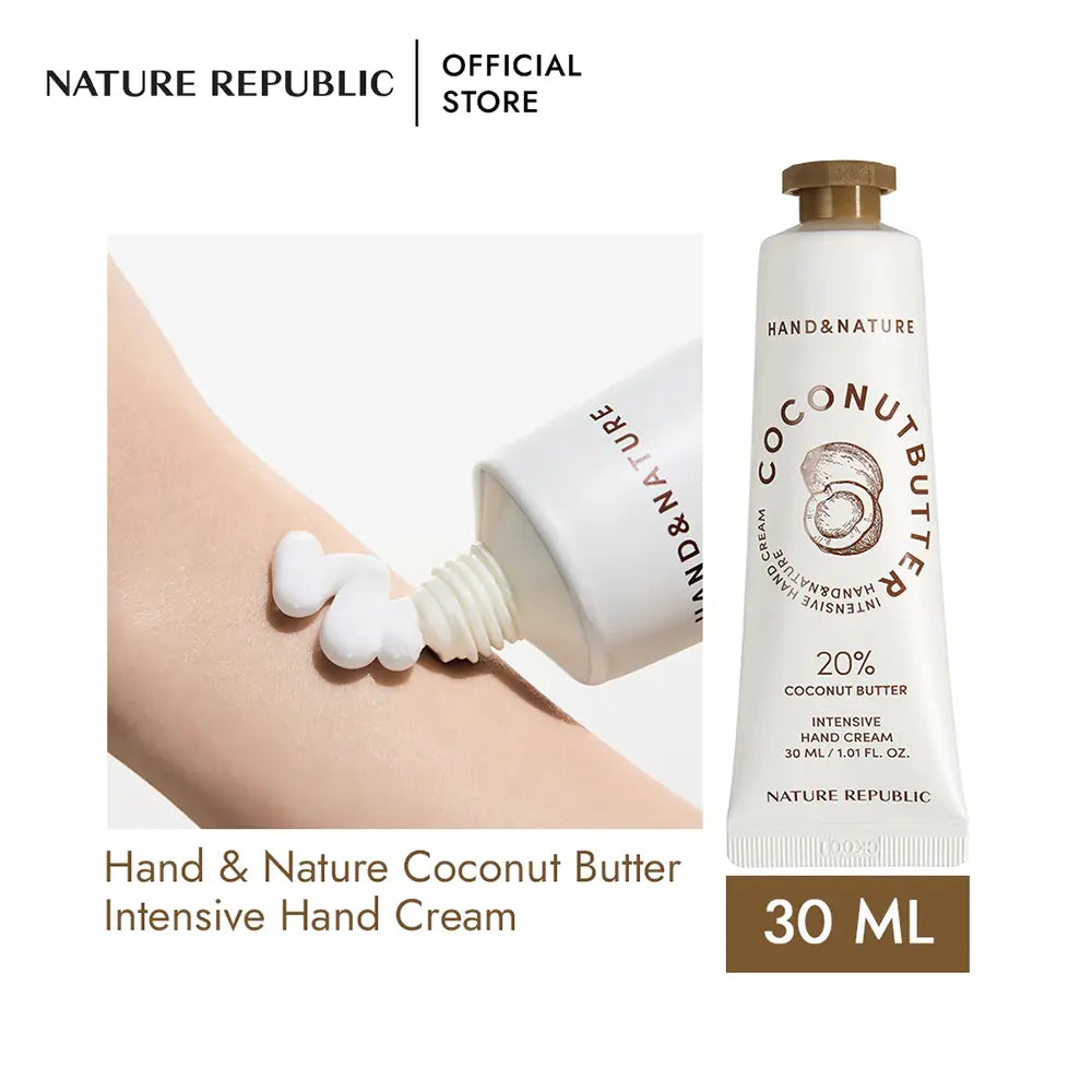 La Coconut Butter Intensive Hand Cream de Nature Republic est une crème mains de cosmétique coréenne conçue pour apporter une nutrition intense et durable aux mains abîmées. Enrichie en beurre de noix de coco, reconnu pour ses propriétés hautement nourrissantes et protectrices, elle aide à restaurer la barrière cutanée et à prévenir la déshydratation.